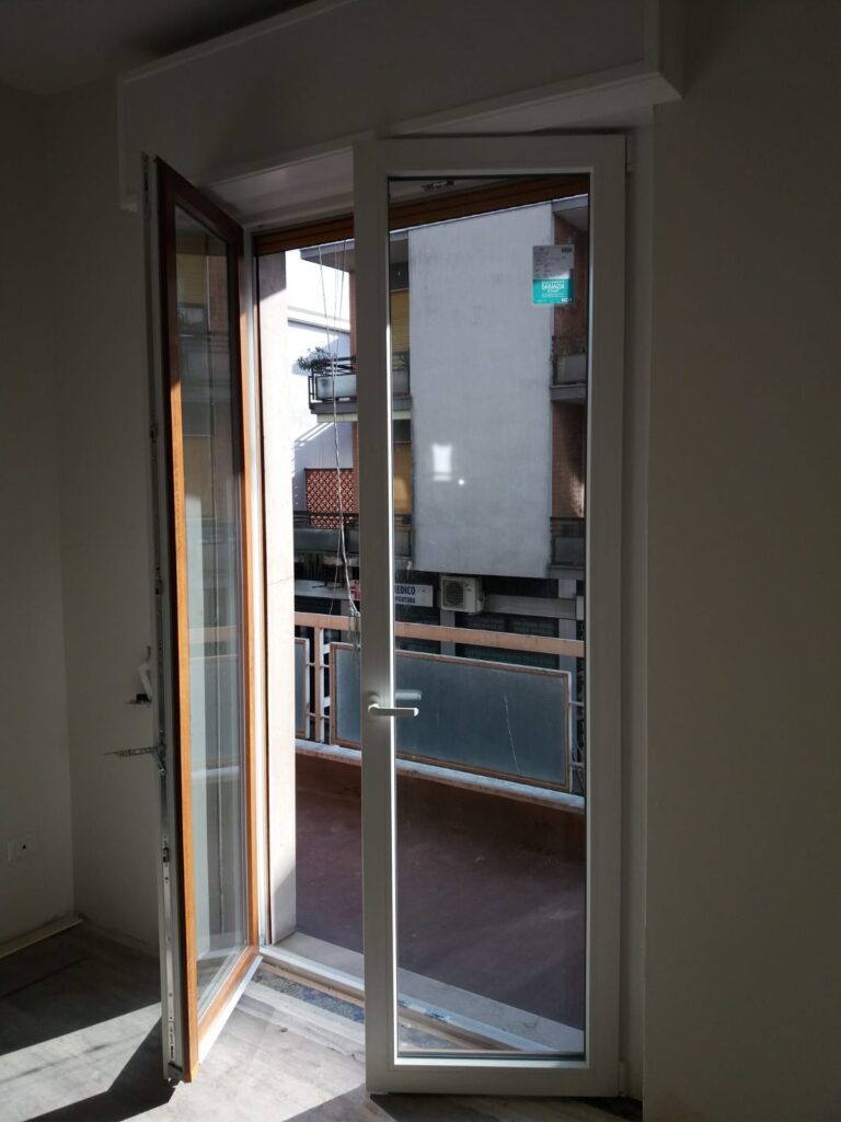 Porta finestra Shuco in bicolore con cassonetto e tapparella in alluminio coibentata con motore elettrico.